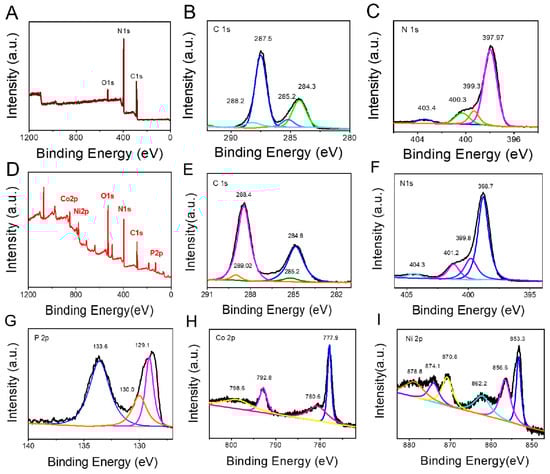 Detailed information on the g-C3N4 and NiCoP/g-C3N4 nanocomposites was obtained by XPS. The survey spectra of bare g-C3N4 and NiCoP/g-C3N4 were shown in Figure 3A,D. C, N and O elements in g-C3N4 and the C, N, P, Co and Ni elements in the NiCoP/g-C3N4 sample were detected, respectively. The detected O 1s peaks in the bare g-C3N4 were mainly due to the surface-adsorbed O2 and H2O molecules. By contrast, the O 1s peak of NiCoP/g-C3N4 increased significantly, which may have been caused by the surface oxidation of NiCoP nanoclusters []. Four binding energy peaks were shown in the C 1s XPS spectrum of the original g-C3N4 at 284.3, 285.2, 287.5 and 288.2 eV (Figure 3B), which originated from the graphitic, C-N/C-O bindings, cyanide/cyanoquione and heptazine typed carbons, respectively. Four peaks located at 397.97 eV, 399.3 eV, 400.3 eV and 403.4 eV were well-suited for the N 1s XPS spectra of g-C3N4 (Figure 3C), which is attributed to the heptazine N, pyrrolic N, graphitic N and oxidic N, respectively []. By comparing the binding energy spectrum after NiCoP deposition, we found the shift in the C 1s and N 1s spectra of NiCoP/g-C3N4 (Figure 3E,F), indicating an internal force between NiCoP and g-C3N4. For the P 2p spectrum (Figure 3G), the binding energy peak was located at 127.7 eV, which was close to the P 2p3/2, indicating the presence of the P element. Moreover, the peak at 131.9 eV could be attributed to the oxidized phosphorus species in contact with air [,]. For Co 2p, 777.25 eV and 792.2 eV the binding peaks were attributed to Co 2p3/2 and Co 2p1/2 of metallic Co because of the formation of Co-P [,] (Figure 3H). Likewise, for the Ni 2p region, the strong binding energy of 852.25 eV was close to the nickel metal (852.6 eV), which implied the presence of partially charged Ni species (Figure 3I). The XPS results further confirmed that NiCoP nanoparticles had been successfully loaded onto the g-C3N4 surface.