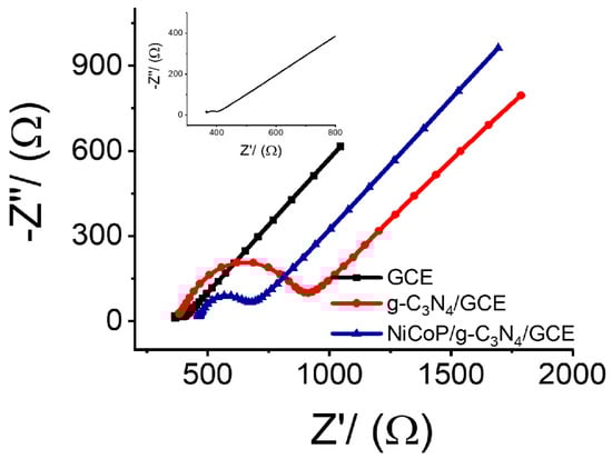 The electrochemical properties of NiCoP/g-C3N4 nanocomposites were evaluated with electrochemical impedance spectroscopy (EIS), with [Fe(CN)6]3−/[Fe(CN)6]4− as the redox probe, and the semicircle diameter was equivalent to the electro-transfer resistance. As shown in Figure 4, compared with the bare g-C3N4, the interface electron transfer resistance (Ret) decreased significantly after the NiCoP/g-C3N4 nanocomposites were modified, indicating that the binding of NiCoP nanoparticles could change the band structure of g-C3N4 and promoted the electron transfer [].