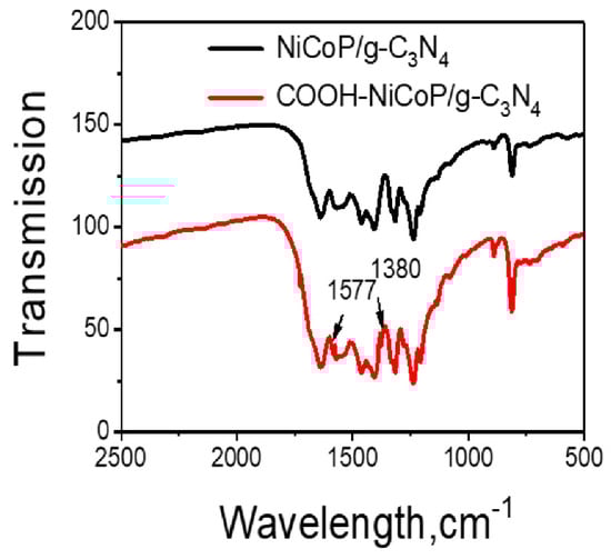 The functionalization of NiCoP/g-C3N4 nanocomposites was investigated using the FT-IR spectrum. The spectral bands at different wavelengths correspond to specific vibrations of molecular functional groups. Figure 5 shows the NiCoP/g-C3N4 before (black line) and after carboxylation (red line) in the wavelength range of 500–2500 cm−1. The band at 806 cm−1 was characteristic of tri-s-triazine, and the bands in the range of 1240–1643 cm−1 could be attributed to the C-N stretching of g-C3N4. Furthermore, the peak at 1380 cm−1 and 1577 cm−1 corresponded to the COO bending band []; these results indicated that the surface of NiCoP/g-C3N4 had been successfully carboxylated.