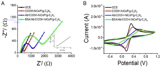 Cyclic voltammetry (CV) and EIS were used to verify the electrode surface modification. As shown in Figure 6 A, the bare glass carbon electrode exhibited almost a straight line, illustrating that the electro-transfer process was mainly caused by mass diffusion. The Ret increased after COOH-NiCoP/g-C3N4 nanocomposites and the antibody(Ab) were modified through π-π stacking and a zero-length amine-reactive cross-linker, EDC and NHS, respectively, which can be attributed to the COOH-NiCoP/g-C3N4 nanocomposites. The larger size of Ab blocked or hindered the diffusion of the redox probe of [Fe(CN)6]3−/4− and eventually increased the electron transfer resistance []. These results were consistent with those obtained from CV measurements (Figure 6B). The above results showed that the sensing interface had been successfully fabricated.