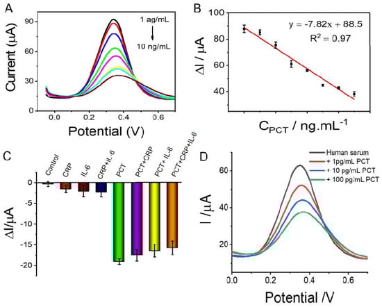 C-reaction protein (CRP) and Interleukin-6 (IL-6) were selected as interfering biomarkers to evaluate the selectivity of this immunosensor. CRP was used to indicate tissue damage inflammation [], and IL-6 has been linked to various diseases such as inflammatory bowel disease, diabetes, osteoarthritis and asthma []. For specific detection, the concentration of PCT, CRP and IL-6 were 1, 10 and 10 pg/mL, respectively. As shown in Figure 7C, for each interfering substance, the DPV value was close to the control sample; however, after mixing with the PCT, the DPV response of the mixture was similar to PCT alone, indicating that our sensor can specifically recognize and capture the PCT. This means that the electrochemical sensor has high specificity and selectivity.