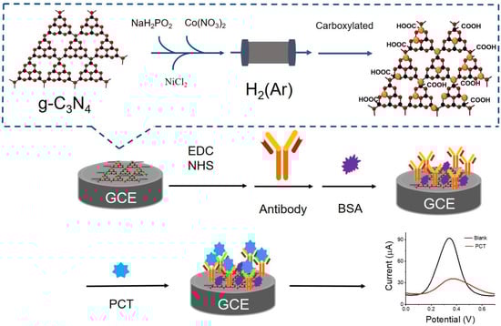 Schematic illustration of the NiCoP/g-C3N4 nanocomposites-based electrochemical immunosensor for detecting PCT. The preparation process of the NiCoP/g-C3N4 and COOH-NiCoP/g-C3N4 was shown in dashed line box.