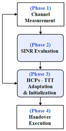 Figure 1, the proposed adaptive handover algorithm consists of four main phases: Phase 1—channel measurement phase; Phase 2—SINR evaluation phase; Phase 3—HCPs—TTT adaption and initialization phase; and Phase 4—handover execution phase. During the first phase, the system measures the signal strength of the serving and target base stations in terms of SINR. The signal strength between the serving and target base station will be extensively evaluated and compared during the second phase. In the third phase, TTT intervals will be adapted automatically based on inputs received from the first phase. At this phase, the system will continuously monitor the channel condition based on the input received from Phase 1, and if it fulfills the given requirements proposed in the ATH algorithm, then it will eventually make HO decisions. During Phase 4, the handover will be performed and executed