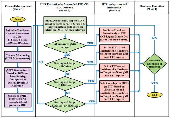 Initialize System Parameters (5G mmWave network) Start Channel Monitoring (SINR Measurement) Generation of gMRTs by 5G mmWave gNBs Generation of eMRTs by centralized eNBs SINR Evaluation by centralized eNBs if the SINR serving gNB > SINR target gNB Handover Decision → False elseif all gNBs outage Handover Decision → True Initiate Handover to centralized eNBs immediately elseif SINR difference between serving and target gNBs < HOMmin Output: Adapt TTTmax if TTT expired and none of neighboring gNBs have highest SINR Handover Decision → True Initiate Handover to target gNB else Handover Decision → False elseif SINR difference between serving and target gNBs > HOMmax Output: Adapt TTTmin if TTT expired and none of neighboring gNBs have highest SINR Handover Decision → True Initiate Handover to target gNB else Handover Decision → False elseif SINR difference between serving and target gNBs is HOMmin < α < HOMmax Output: Adapt α TTT based on Equation (6) if TTT expired and none of neighboring gNBs have highest SINR Handover Decision _True Initiate Handover to target gNB else Handover Decision → False end end end end