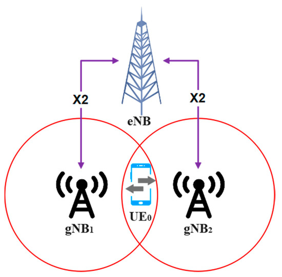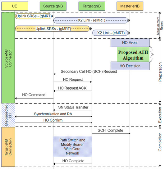 Figure 2. Once the TTT interval has been initiated, the master eNB will hold the condition until the TTT interval expires and eventually triggers the handover to the target gNB by sending a secondary cell handover (SCH) request. The rest of the handshaking process will occur, as shown in
