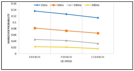 Figure 8 depicts the HOP with different mobile speed scenarios and TTT intervals. The HOP is gradually decreased with the increase of the UE speed in the given network scenario. This happens because, when the UE moves with high speed, it takes less time to exit the cells’ edge, eventually decreasing the HOP and vice versa. The shorter (i.e., 25 ms) TTT intervals (at both high and low speeds) increase the HOP dramatically; meanwhile, the longer (i.e., 200 ms) TTT intervals significantly reduce the HOP for the same speed scenarios. Even though longer TTT intervals decrease the HOP probability, this negatively affects the RLF rate, which is important to maintain the UE link connectivity with the base station. In summary, the TTT intervals have a direct relationship with the RLF and inverse relationship with the HOP. The findings in [
