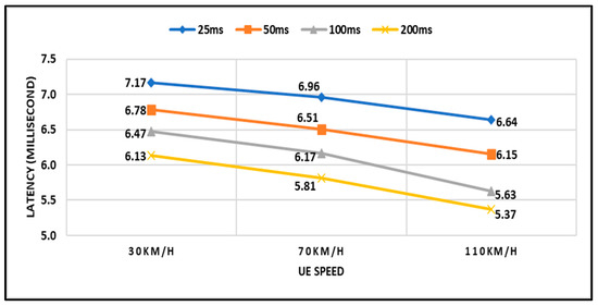 Figure 8), the latency is gradually decreased with the increase of the UE speed for the given network scenario. This happens because, when the UE moves with high speed, it takes a shorter time to reach the cells’ edge and eventually decreases the latency and vice versa. The highest latency is observed when TTT intervals are short (i.e., 25 ms); meanwhile, the lowest latency is observed when TTT intervals are high (i.e, 200 ms) for all speed scenarios. In general, the latency that is obtained by all TTT intervals, as observed in the graph, is still considered high where 5G communication is concerned. This is due to either the higher HOP that is caused by a shorter TTT or the higher RLF rate that is caused by a longer TTT or the combination of higher HOP and RLF that is caused by the moderate TTT intervals. For example, the latency (i.e., 7.17 ms) that is obtained at the UE speed of 30 km/h for TTT interval of 25 ms was caused by the higher HOP; meanwhile, the latency (i.e., 6.13 ms) that was obtained at the UE speed of 30 km/h for the TTT interval of 200 ms was caused by the higher RLF rate. Therefore, the TTT adaptation for handovers is essential to reduce the latency and boost the network performance in 5G communications.
