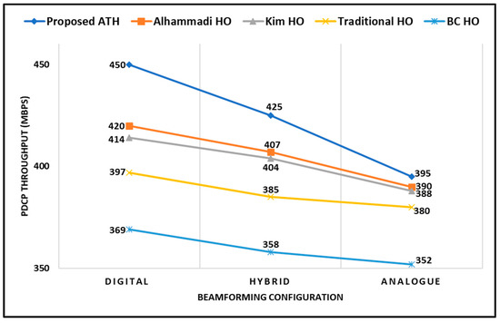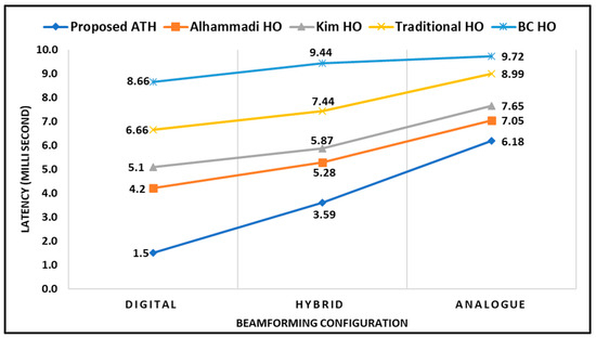 Figure 10, the performance comparison of handover latency over different beamforming configurations is depicted. It can be observed that the latency increases for different configurations of beamforming. This increase is caused by a less adaptation opportunity provided by other hybrid and analogue configurations compared to digital, therefore leading to rapid drops in SINR and consequent failures of the handover. The figure further shows that the proposed ATH mechanism enables the UE to optimally switch to the best mmWave gNB base station and eventually outperformed other competitive techniques. This significant performance is achieved by the fact that our proposed ATH mechanism optimizes the handover parameters, such as TTT, that are directly related to user’s connectivity. On the other hand, when the UE is attached to a certain base station for a longer time without a proper adaptation strategy, it will cause more latency in forwarding the packets to the new suboptimal cell once the handover is triggered.