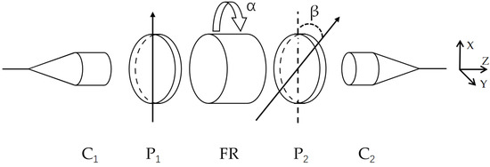 A non-reciprocal optical attenuator mainly comprises two collimators, two polarizers, and a Faraday rotator. The specific structure is shown in Figure 1. Based on the reference coordinate system on the right side of the figure, the transmission axis of polarizer 1 is parallel to the x-axis. The rotation direction of the Faraday rotator is from the x-axis to the y-axis, and the rotation angle is α. The angle between the transmission axis of polarizer 2 and polarizer 1 is β.