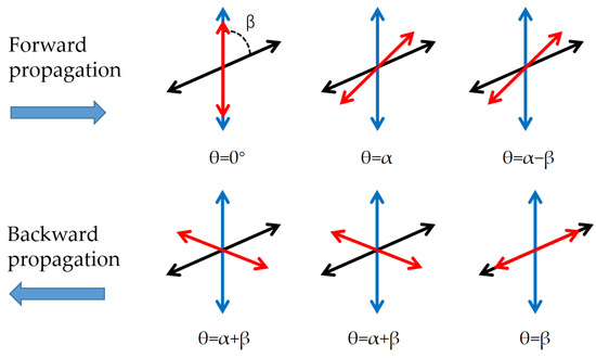 Angle change of linearly polarized light in different propagation directions: forward propagation along +z direction and backward propagation along −z direction. θ is the angle of linearly polarized light.