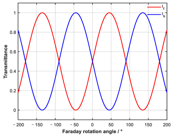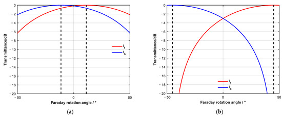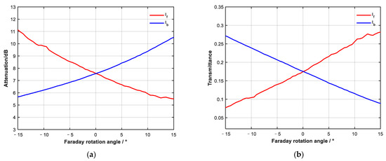 As shown in Figure 3, when the angle between the two polarizers is 45°, the adjustment of the Faraday rotation angle to forward and backward attenuation is periodic. The adjustment period of forward and backward attenuation is 180°. The forward and backward attenuation are the same when the Faraday rotation angle is α = k × 90° (k is an integer). When the Faraday rotation angle is α = 45° + k × 180°, the device becomes a forward conduction device. When the Faraday rotation angle is α = −45° + k × 180°, the device becomes a backward conduction device.