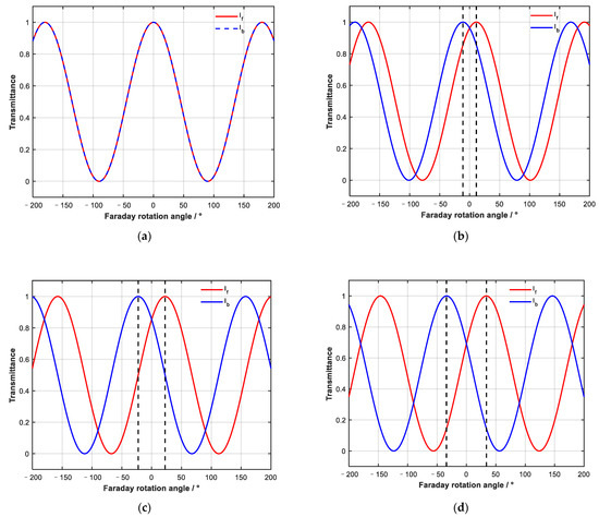 It can be seen from Figure 4a that when β is 0°, the forward and backward transmission curves are the same, and the device has no non-reciprocal adjustment function. At the same time, different β values will affect the transmittance when the forward and reverse attenuation are equal. It can be seen from Figure 4 that when β is π/16, the transmittance is about 96% and 4% when the forward and backward attenuation are equal; when β is π/8 the values are 86% and 14%; when β is 3π/16, the values are 69% and 31%; and when β is π/4, the value is 50%.