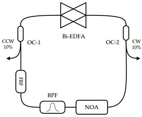 The bidirectionally operated erbium-doped fiber amplifier (EDFA) provides the gain in the bidirectional fiber laser. A narrow band-pass filter with a bandwidth of 0.4 nm and a fiber ring filter with a ring length of 60 cm were used to reduce the number of longitudinal modes in the system. The system was a fully polarization-maintaining structure. The monitoring of forward and backward optical power was completed through 90:10 couplers. In Figure 8, the forward transmission direction is clockwise, and the backward transmission direction is counterclockwise.