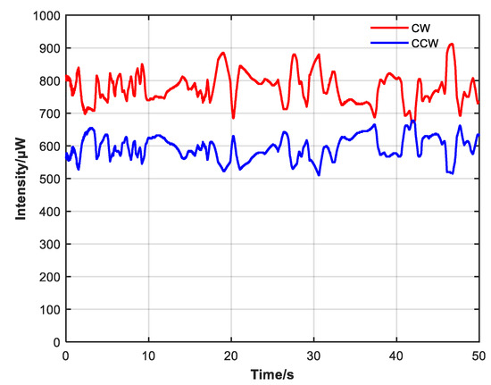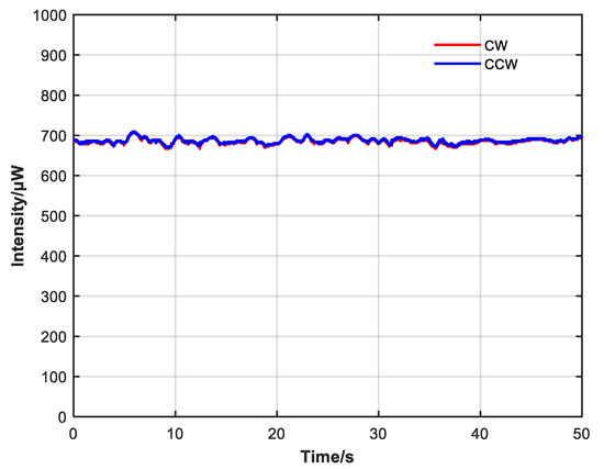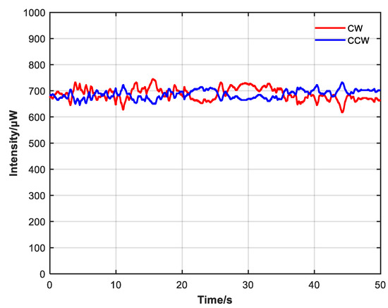 It can be seen from Figure 14 and Figure 15 that CW and CCW intensity are very close at 50 and 500 s, which suppresses the power fluctuation with large amplitude and the expansion of the power difference caused by the long operation time of the system and achieves a good closed-loop control effect.