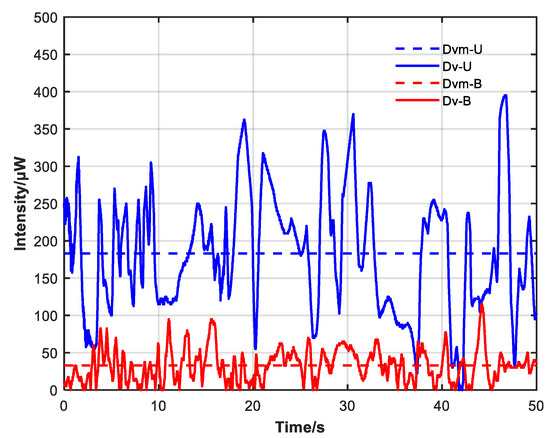 Change curve of difference between CW and CCW light intensity with and without non-reciprocal attenuator. Dv-U: difference in light intensity without non-reciprocal attenuator. Dvm-U: average of Dv-U. Dv-B: difference in light intensity with non-reciprocal attenuator. Dvm-B: average of Dv-B.
