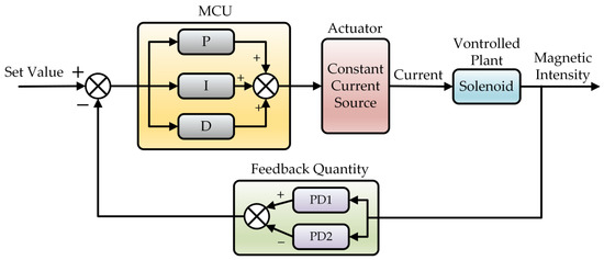 In order to overcome the defects of open-loop control, a closed-loop control system was built (Figure 12) to detect the difference between CW and CCW intensity using two 80 MHz photoelectric detectors (PDs) and calculate the control quantity according to the difference and PID algorithm in MCU, with a control cycle of 1 ms. Finally, the solenoid current was controlled to change the Faraday rotator’s rotation angle, and then different attenuation values were introduced to the CW and CCW directions to achieve the purpose of intensity equalization.