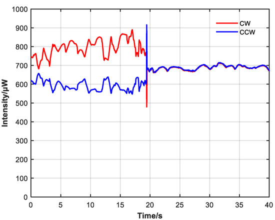 Due to the pump and the difference in attenuation of the CW and CCW resonator without the non-reciprocal attenuator, the difference in CW and CCW optical intensity is significant, and there are large intensity fluctuations, as shown in Figure 9. During the observation process, the intensity difference between CW and CCW directions continuously shifted, indicating an unstable state of continuous gain competition. Then, the non-reciprocal optical attenuator was added, and the pump power was adjusted so that the average output intensity of the system was similar before and after adding the attenuator.