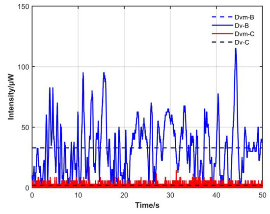 Change curve of difference between CW and CCW light intensity with and without closed-loop control. Dv-B: difference in light intensity without closed-loop control. Dvm-B: average of Dv-B. Dv-C: difference in light intensity with closed-loop control. Dvm-C: average of Dv-C.