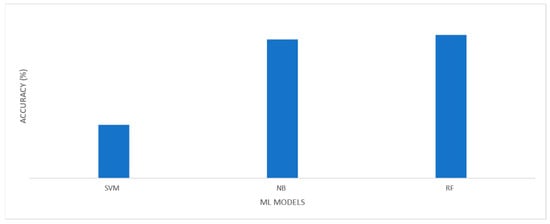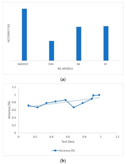 Figure 6a,b compares two validation procedures: stratified k-Fold and 10-Fold CV. In stratified K-10, the output of the models XGBoost and RF was better compared with those models obtaining 92.75% and 91.53%, respectively, whereas the models SVM and GNB achieved 90.3% and 91.2%, respectively.