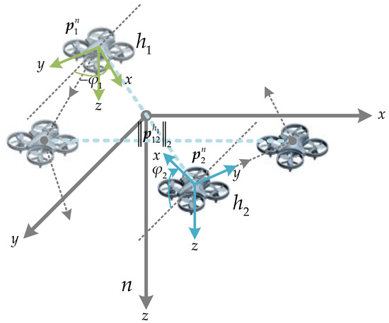The relative motion of two MAVs is described in h. Let denote the position vector of MAV i in n, where the subscript i refers to the MAV number and the superscript n indicates the vector is projected onto n. The projection of the relative position of MAV k (k = 1, 2, but ) with respect to MAV i in can be expressed as: