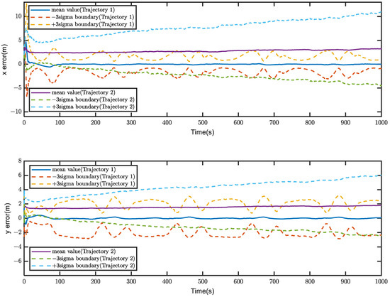 For the purpose of avoiding experimental randomness, Monte Carlo simulation experiments were conducted to investigate the error statistical characteristics of Trajectory 1 and Trajectory 2. Figure 5 presents the results of 100 Monte Carlo simulation experiments for error statistics. The upper and lower dashed lines of the error curves represent the +3σ and −3σ boundaries, respectively, while the solid lines represent the error mean. The boundary values represent the positioning accuracy, and the boundary range represents the positioning stability. The specific data for Figure 5 is listed in Table 6. It can be concluded from Figure 5 and Table 6 that the positioning accuracy and stability of Trajectory 2 are worse than those of Trajectory 1, and the positioning error of Trajectory 2 exhibits a diverging trend.