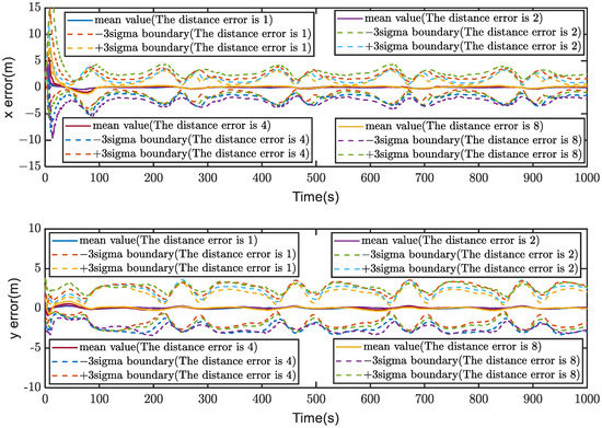 Subsequently, 100 Monte Carlo simulations are conducted, and the simulation results are presented in Figure 7. It can be visually observed that the larger the ranging error, the worse the system’s positioning accuracy and stability. However, increasing ranging errors did not cause the positioning accuracy and stability of the proposed system to deteriorate significantly, meaning the system did not diverge, but only increased the error. Specifically, the average boundary value increased from about 2 m to around 3 m as ranging errors increased from 1 m to 8 m. These experimental results indicate that different ranging errors have a limited impact on the system’s positioning accuracy and stability.