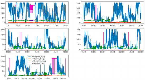 Since the CGAN-CNN-LSTM model is relatively advanced, it is meaningless to compare it with the BP neural network, Elman neural network, and other prediction models, so the CNN-LSTM, LSTM, and SVM prediction models were selected for comparative experiments. First, we imported all the data sets. From Figure 6, it can be seen that the data in the first part and the data in the fifth part are obviously missing. Figure 7 shows the effect after supplementing the data with the CGAN correlation, data supplements have been highlighted in different colors.