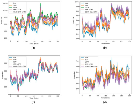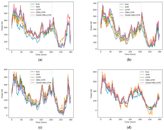 It can be seen from Table 3 that the average values of of the four prediction models of CGAN-CNN-LSTM, CNN-LSTM, LSTM, and SVM are 0.911, 0.873, 0.888, and 0.891; the average values of are 0.0733, 0.0872, 0.0826, and 0.0783, respectively.