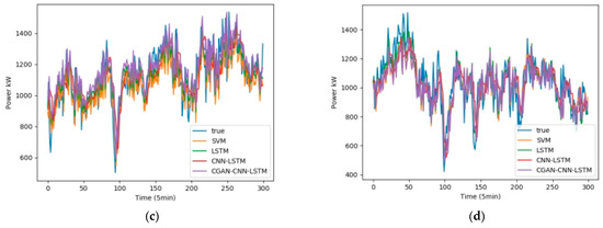 It can be seen from Table 5 that the average values of of the four prediction models of CGAN-CNN-LSTM, CNN-LSTM, LSTM, and SVM are 0.911, 0.887, 0.881, and 0.892; the average values of are 0.0847, 0.1056, 0.1060, and 0.1001, respectively.