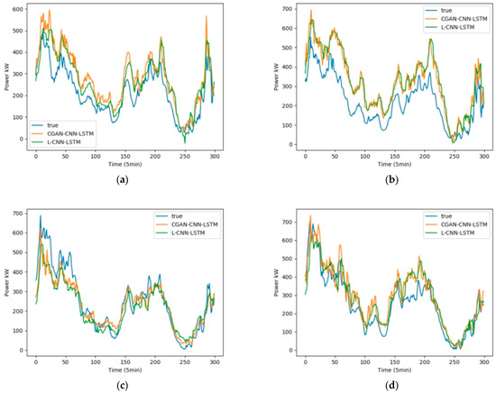 It can be seen from Table 4 that the average values of of the four prediction models of CGAN-CNN-LSTM, CNN-LSTM, LSTM, and SVM are 0.925, 0.912, 0.899, and 0.898; the average values of are 0.0710, 0.0739, 0.0785, and 0.0803, respectively.