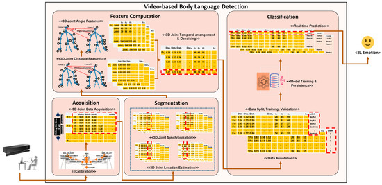 We utilized 3D skeleton joint data constituting upper body motion patterns obtained from the Kinect v2 sensor for Skeletal-based Emotion Recognition. This utilizes the Unobtrusive Skeletal-based Emotion Recognition (UnSkEm) framework for learning emotions through body movements as proposed by Asif et al. [36]. The UnSkEm framework comprises of four sub-modules: Skeletal Joint Acquisition, Skeletal Frame Segmentation, Feature Computation, and Emotion Classification, as shown in Figure 4.
