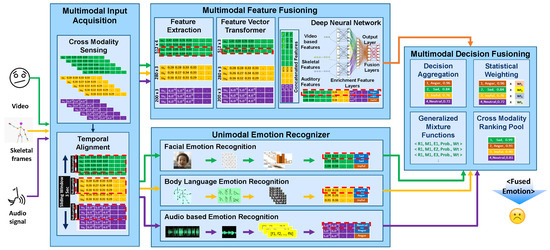 In the subsequent sections, we discuss solutions to the above-mentioned challenges linked with multimodal feature fusion and decision fusion. These solutions mainly included supervised learning approaches to gather common behavioral patterns linked with a specific emotion. Furthermore, the challenges of accuracy and generalizability associated with multimodal emotion fusion are resolved using the proposed technique for feature fusion and decision fusion as elaborated in Figure 6.