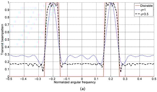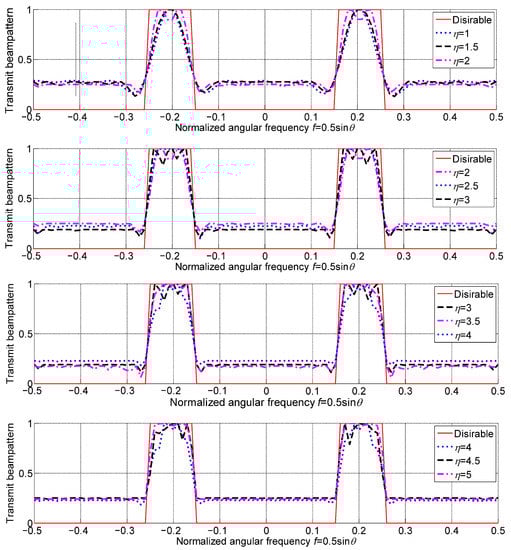 Given a group of selected representative angular frequencies denoted by , we assume that desirable transmit beampattern responses are . The real transmit beampattern at can be expressed as