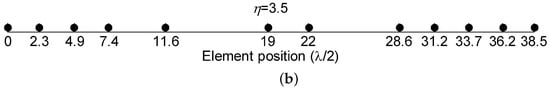 Figure 2a indicates that the advantage of spacing optimization is obvious. The array spacing optimization gives rise to a better transmit matching performance than the method without spacing optimization. Meanwhile, additional degrees of freedom result in a lower sidelobe level of the transmit beampattern. Figure 2b shows the element positions after optimization, indicating that both the minimal spacing and the total aperture meet the prescribed settings.
