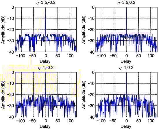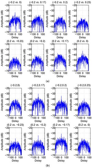 In Figure 4a,b, all sidelobe outputs are lower than dB, much lower than auto-correlation sidelobes. Such a significant performance improvement is mainly caused by the receive beamforming operation, which has efficiently suppressed cross-correlation sidelobes of angular waveforms. Their difference is insignificant in this measure. For the 12-element receive array, the attenuation factors for the correlation pairs are shown in Table 1. The attenuation factor depends on the interval, i.e., a larger distance of two directions tends to have a lower attenuation factor. More attenuation factors regarding other correlation pairs can be computed through (2).