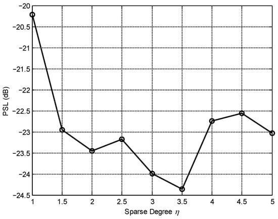 In practice, different numbers of array elements may result in different turning points of . For the case at hand, it is , i.e., times the half wavelength. It means that the degrees of freedom that can be extracted from spacing optimization have a limit. The final PSL is proportional to the transmit beampattern mismatch, so the total aperture has a similar effect on the PSL, which is not discussed here anymore.