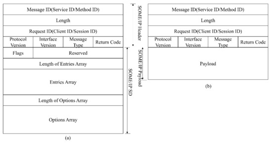 The communication based on SOME/IP is divided into two phases. The first is the service discovery process, specified by SOME/IP Service Discovery Protocol [47], and the second is the normal communication process, specified by SOME/IP Protocol [48]. The SOME/IP-SD message and SOME/IP message format are shown in Figure 1.