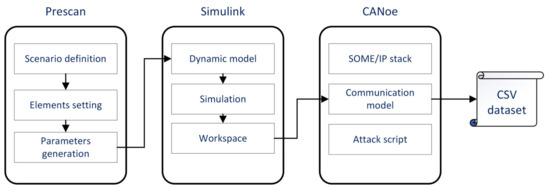 So far, there is no recognized SOME/IP dataset for intrusion detection in the industry. Since SOME/IP-based service-oriented communication has not been widely deployed in mass-produced vehicles, actual vehicle data communicating via SOME/IP cannot be collected. The literature [45] provides a SOME/IP data generator, but this generator can only generate the header of SOME/IP and fill in the payload with random numbers or fixed values. This makes it inconvenient to conduct a comprehensive intrusion detection study. The toolchain of Prescan, Simulink, and Vector CANoe is used to build the SOME/IP dataset to fill this gap. Prescan is a simulation platform for ADAS function development, which integrates modules involved in intelligent driving simulation, such as road scenes, smart cars, sensor models, vehicle dynamics configuration, and environmental perception. Simulink is a block diagram environment for modeling, analyzing, and simulating dynamic systems. CANoe is a bus development environment produced by VECTOR, which can be used for modeling, simulation, testing, and development of automotive buses. Simulating the ADAS function with Prescan and Simulink is one of the most common methods nowadays. Moreover, CANoe produced by Vector is widely used for in-vehicle network simulation and testing. Through this toolchain, traffic that meets the protocol requirements and has ADAS meaning can be generated. The data generation process is shown in Figure 4.