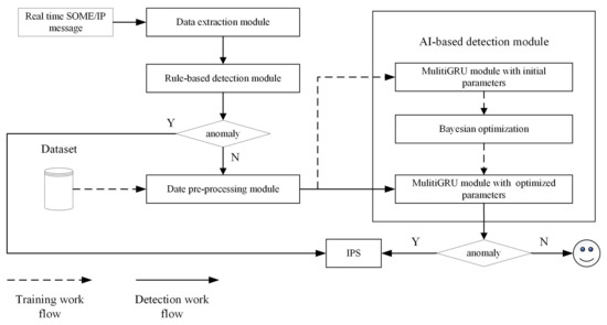 The multi-layer IDS consists of rule-based detection and AI-based detection. The models in AI-based detection are trained before the IDS works appropriately. Figure 5 describes the system architecture of multi-layer IDS and reflects its workflow. In the training phase, the data are imported from the database into the data pre-processing module, which includes feature deserialization, normalization, and sequence generation. Sequence enters the initial multi-GRU model for training, and Bayesian optimization is used to obtain the hyperparameters of the model. During the detection phase, real-time SOME/IP packets flow from the IVN to the IDS. The packet enters the data extraction module, where the features for IDS are extracted. These features first enter the rule-based intrusion detection module. When all the rules are passed, the event packet will go through the pre-processing module to generate the feature sequence and enter the AI detection module. Other types of packets will jump out directly after entering the AI detection module and are marked as normal. When the results of both detection modules are normal, the packet is classified as normal. If any rules are not satisfied or the detection result of AI-based IDS is abnormal, the IPS will trigger related protection mechanisms, such as alerting, isolation, etc.