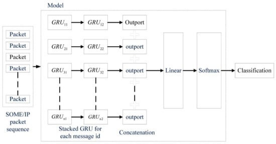 Multi-GRU is a scalable supervised learning architecture with GRU as the core unit, as shown in Figure 7. Each message ID corresponds to a stacked GRU with a depth of 2. Increasing the network depth is intended to improve the efficiency and accuracy of model training and detection. The hidden layer outputs of all stacked GRUs are concatenated together to increase data interconnection between message ids. The classification results are obtained through the linear layer and the softmax activation function.