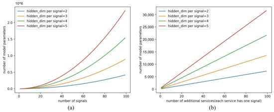 Compared with the single-GRU model, the proposed multi-GRU model has better scalability. The number of IDs increases as the system expands. According to actual design requirements, the ID and signal may be 1-to-1 or 1-to-x. The extreme case is that all IDs have a 1-to-1 relationship with signals, which is also allowed and recommended for service-based communication. In the 1-to-1 case, the relationship between the number of parameters and N for the single-GRU and multi-GRU models is shown in Figure 8. When is 5 and N reaches 40, the multi-GRU model has 12,000 model parameters, while the parameters of the single-GRU model are about 500,000, which is close to 40 times that of the former. The growth rate of single-GRU increases with N, which is a constant in the multi-GRU model.
