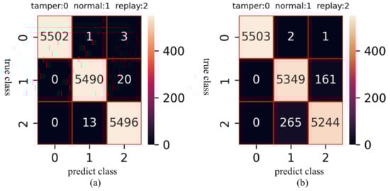 In Figure 10, it is evident that the loss of the multi-GRU model converges faster and closer to zero during training. The training loss is close to 0 in less than 60 epochs in multi-GRU training. On the contrary, after 250 epochs in single-GRU training, the training loss is still a little far from 0. The detection performance of the two models against different attack types is listed in Table 10. It can be found that the multi-GRU model has excellent detection performance for tamper, normal, and replay, and the accuracy is as high as 99.77%. In contrast, although the single-GRU model also has a very high detection rate for tamper data, its detection performance in the replay and normal data is poor. The accuracy of this model is 97.4039. A more intuitive classification result can be shown in Figure 11. It can be found that the single-GRU model has serious misjudgments between replay and normal data.