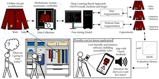 Hence, this study addresses the challenge of identifying defects in clothing, i.e., holes and stains, using computer vision advances, namely object detection techniques, contributing to a higher standard of living for blind people when deciding what to wear. Deep learning methods have become a powerful approach for directly acquiring feature representations from data, resulting in significant advancements in the domain of object detection [9,10]. The proposed methodology is an extension of a previous work by the authors [11,12,13,14,15,16], and makes notable contributions to the field by offering: (i) a compilation of techniques utilized in object detection for the identification of clothing defects, (ii) an annotated dataset of clothing defects that can be utilized by the research community for additional studies, and (iii) a comparison of different versions of YOLOv5 networks for the detection of defects on clothing. The validation of the developed work was conducted through a collaboration with the ACAPO and the Association of Support for the Visually Impaired of Braga (AADVDB), which helped to identify key areas for improvement. The findings of this research envisage future practical applications to complement the presented algorithms and methodology, namely a mobile application and a mechatronic system, i.e., an automatic wardrobe. The following sections include an overview of related work (Section 2), the methodology (Section 3), results and discussion (Section 4), and conclusions and future work (Section 5).