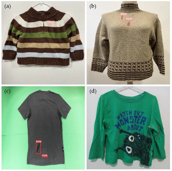 To the best knowledge of the authors, the previous research on clothing category classification and stain detection [16] remains the only dataset that specifically focus on defects in clothing. Consequently, it was found necessary to expand the existing dataset and evaluate novel neural networks to improve the previous work. Individuals’ clothing collections were the source of the data, which was then deliberately altered through the creation of defects, and manually labeled. The dataset was enhanced by adding stain defects and incorporating hole defects, resulting in ca. 340 images. As a result, each individual garment may exhibit several defects, distributed throughout diverse regions of the attire, namely on the backside, thereby resulting in an aggregate quantity of ca. 647 defects. Table 2 shows the representation of each defect class.