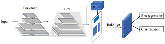 As shown in Figure 1, the two-stage model performs feature extraction on the input image through the neural network with a feature pyramid network (FPN) [39]. The backbone extracts different scales of region-of-interest (RoI) features from different stages of the feature pyramid. The FPN contains a bottom-up path and a top-down path with a lateral connection. The path from the bottom to the top builds a hierarchical structure, which can extract features at different scales. The path from the top to the bottom produces higher-resolution features through upsampling, and its semantic information is stronger. Each lateral connection combines feature maps of the same scale in the top-down and bottom-up paths to form a new pyramid level, and each level makes independent predictions. Higher-resolution feature maps help detect small targets, while lower-resolution feature maps contain rich semantic information, so constructing the FPN is essential.