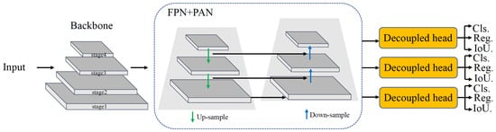 As shown in Figure 2, the one-stage model generally comprises three parts: a backbone, a neck, and a head. The backbone mainly determines the feature representation ability. Meanwhile, its design significantly impacts the inference efficiency since it carries a high computation cost. The backbone is divided into multiple stages to extract features at different scales and facilitates features fusion later. Usually, the neck, located between the backbone and the head network, further improves the diversity and robustness of the features. The neck aggregates low-level physical features with high-level semantic features and then builds up pyramid feature maps at all levels. A neck is composed of several bottom-up paths and top-down paths. Building a pyramid on the feature map better solves the problems induced by changes in the scales of the targets. The famous examples are the feature pyramid network (FPN) [39] and the Path Aggregation Network (PAN) [41]. The FPN improves the size of the feature map to solve the problem of the scale sizes of different targets in detection. The PAN increases the network’s depth, improves the network’s robustness, and enhances the target-positioning ability to a certain extent. The FPN can capture strong semantic features from top to bottom, and the PAN conveys strong positioning characteristics from bottom to top. Hence, combining these two modules can effectively realize target positioning. The head consists of several convolutional layers, which use convolution to adjust the number of channels on the three scales of the neck network. It predicts the final detection results according to multi-level features assembled by the neck. The decoupled head for classification and localization, widely used in object detection [42,43], speeds up the convergence.