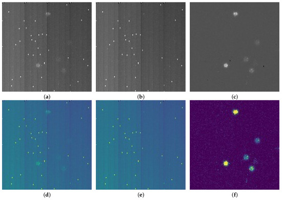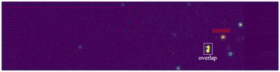 As shown in Figure 4, the upper row is a gray scale of the pre-processed images. The lower row is the corresponding pseudo-color image, where the visual effect of data pre-processing is more straightforward. This pre-processing mechanism is also part of the cluster-locating algorithms used when implementing the deep learning approach in the physics experiments. It can remove empty frames and invalid clusters, thus improving the speed and accuracy of cluster detection.