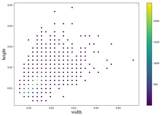 The pre-processing data establish the dataset, where the ratio of the training set to the validation set is 3:1. As shown in Figure 5, the clusters generally have two types: the first one is a single cluster (red circle), and the other is several overlapping clusters (white rectangle). A single cluster presents a circle-like shape, and the occupancy of single clusters is higher than that of overlapping clusters. Figure 6 shows the height and width distribution of the clusters. The overall relationship between the height and width of the clusters is linear, which conforms to the shape type of the cluster.
