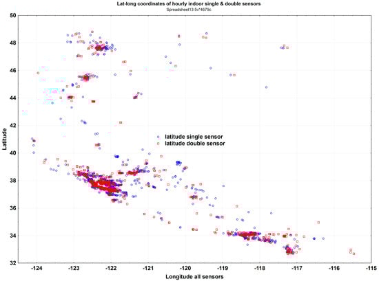 A previous study collected publicly available particle number concentrations from ~10,000 outdoor and 4000 indoor PurpleAir monitors in the states of Washington, Oregon, and California, covering the 4.7-year period from 1 January 2017 to 8 September 2021 [1]. There were 9910 outdoor PurpleAir PA-II monitors with two PMS 5003 sensors. The indoor monitors consisted of 1178 PA-II monitors and 3500 PA-I monitors with a single PMS 1003 sensor. The locations of the 4678 indoor monitors are provided (Figure 1).