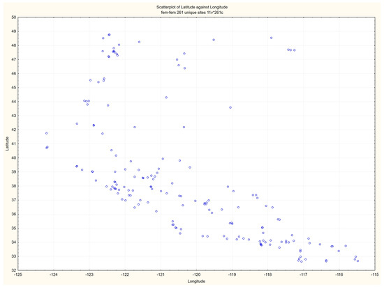 In the present study, we downloaded all daily mean PM2.5 concentrations for 261 US EPA regulatory monitors in the three West Coast states for the 5-year period from 2017 through 2021 (https://aqs.epa.gov/aqsweb/airdata/download_files.html#Daily, accessed on 27 April 2023) These instruments are located in 135 unique sites in multiple cities located in the three states of Washington, Oregon, and California. They are under the authority of the US EPA, located in Washington, DC and Research Triangle Park, NC. Locations of the regulatory monitors are shown (Figure 2).